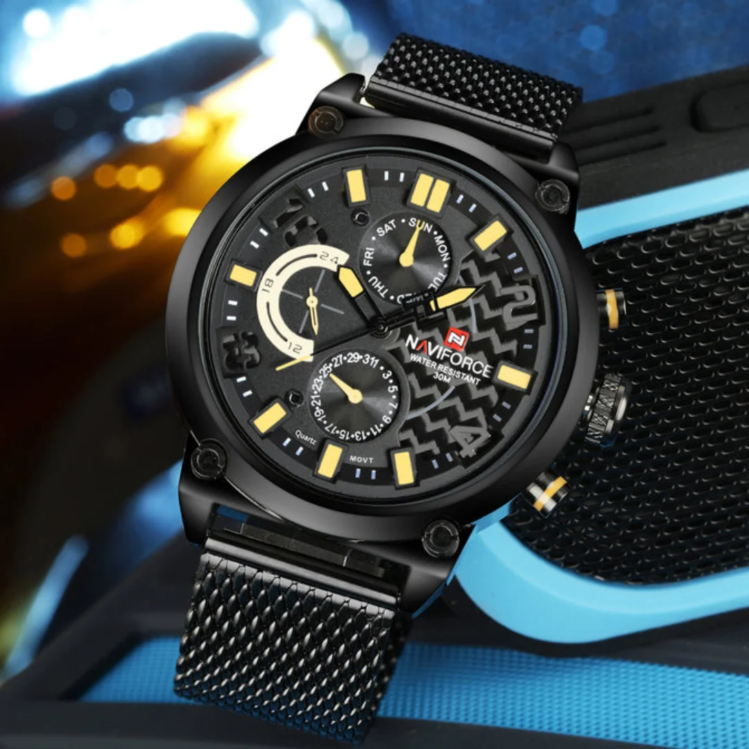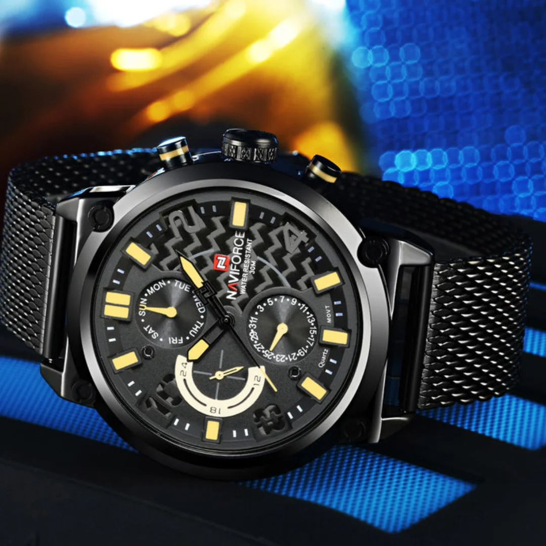 fashionable and casual style, working with three small dials, covering time, day of the week, date and other timing functions, clearly reading the time;