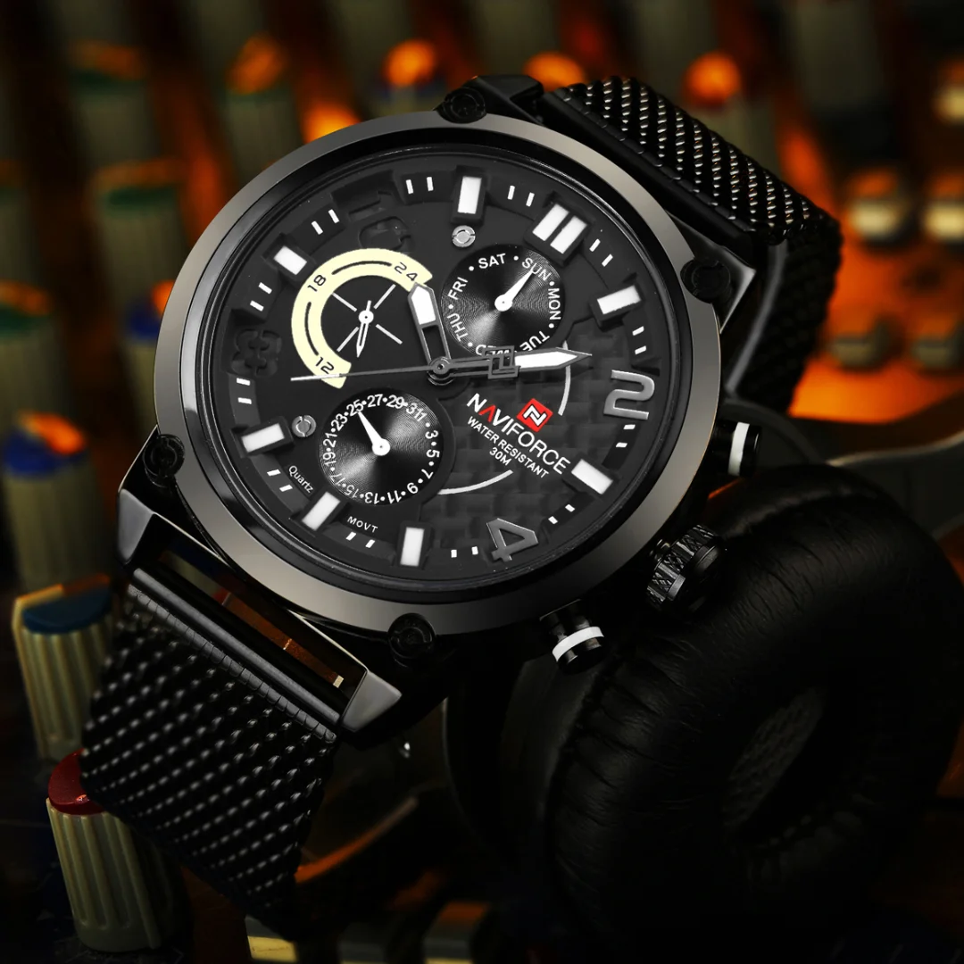 fashionable and casual style, working with three small dials, covering time, day of the week, date and other timing functions, clearly reading the time;